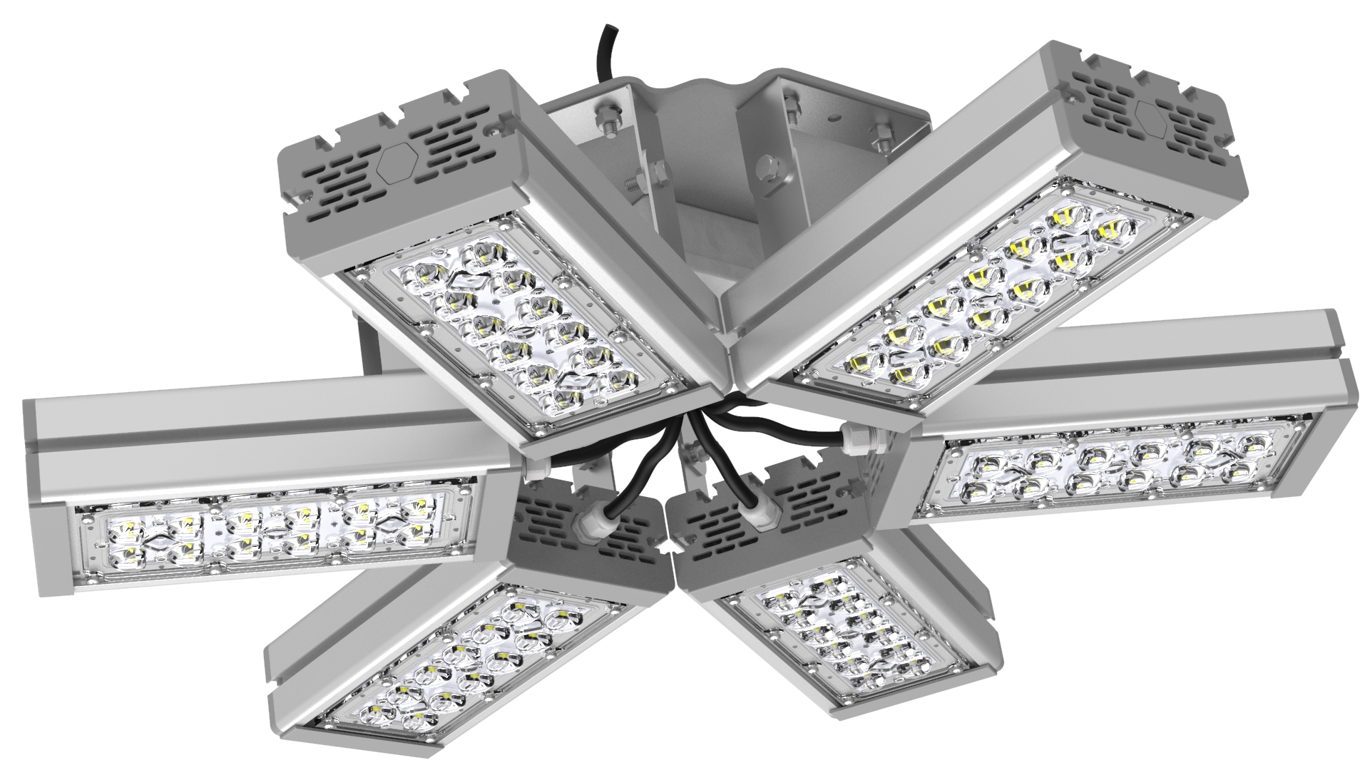 Подвесные промышленные светильники класса High-Bay с креплением на трос в 1 точке. Защита от 380В. Каждая секция имеет регулировку наклона.