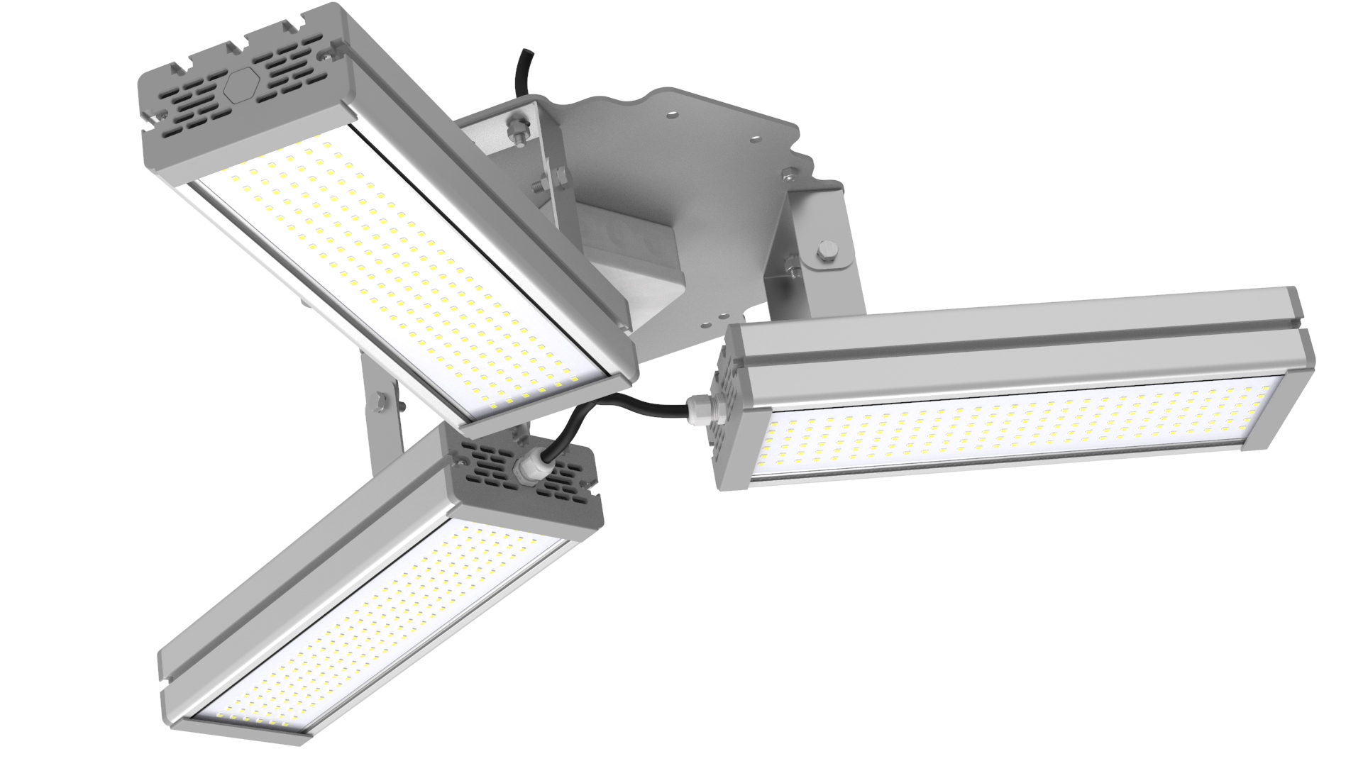 Подвесные промышленные светильники класса High-Bay с креплением на трос в 1 точке. Защита от 380В. Каждая секция имеет регулировку наклона.